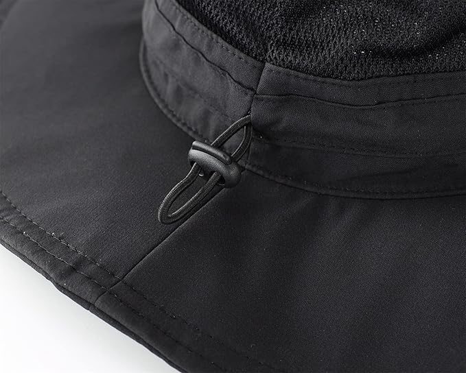 - Adjustable: The chin strap holds hat in place, and elastic drawcord with toggle at back for adjustability