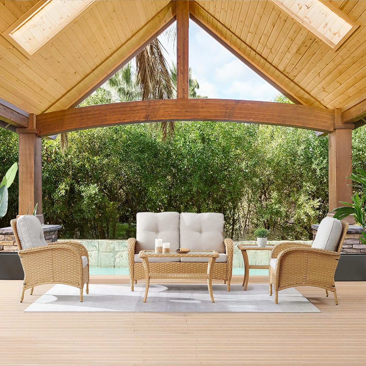 - Comfy Spot for Relaxation:Create an instant gathering spot on your porch or garden with this 4-person seating patio set.This outdoor sectional furniture includes one loveseat, two rotating gliding chairs, One 2-layers coffee table and a side table. 4'' Thick cushions add more comfortable experience.