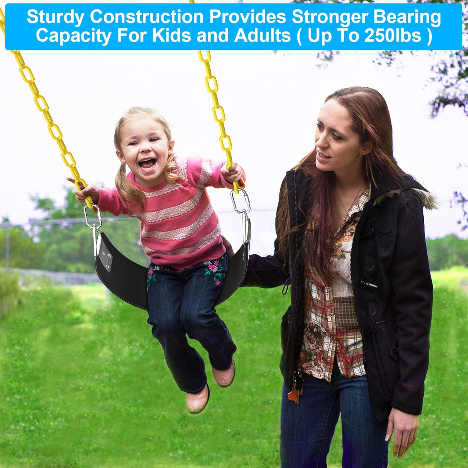 - ♦ DURABLE CONSTRUCTION - This swing seat was crafted with heavy duty parts and material to ensure hours of fun and years of play. The heavy duty swing seat is rated to hold up to 113KG /250LB. The durable design is built to accommodate up to 250 pounds which means adults can join in the fun too!