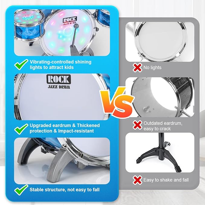 - Cool Musical Gift:Beautiful appearance and flashing lights are really attractive. good choice as a birthday gift. Whether they're playing drum kit with friends or solo, our kids drum kit set is the great choice for young musicians everywhere