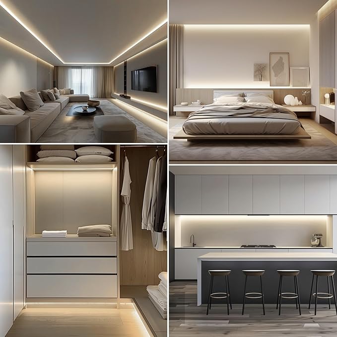 - INDOOR LED STRIP LIGHTS: Our LED light strip can be used for indoor decoration, can be installed on the ceiling of the living room, bedroom, and bathroom, stairways, bookshelf, under the cabinet of the kitchen or other room decoration.