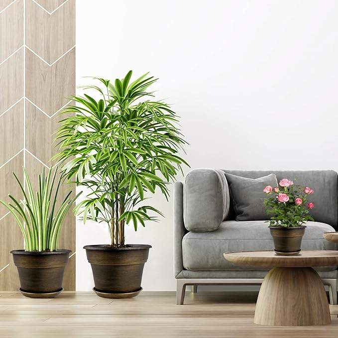 - 【TRADITIONAL DESIGN】Plastic planters for indoor plants with trays are designed in in dark gold colors & a classic look, which allow this pot to fit into any indoor & outdoor setting. With these golded flower pots, it could adds fresh, decorative flair to your home. Decorate your windowsill, desktop, shelf, bedroom, living room, kitchen, garden, office with our 11 inch plastic plant pot.