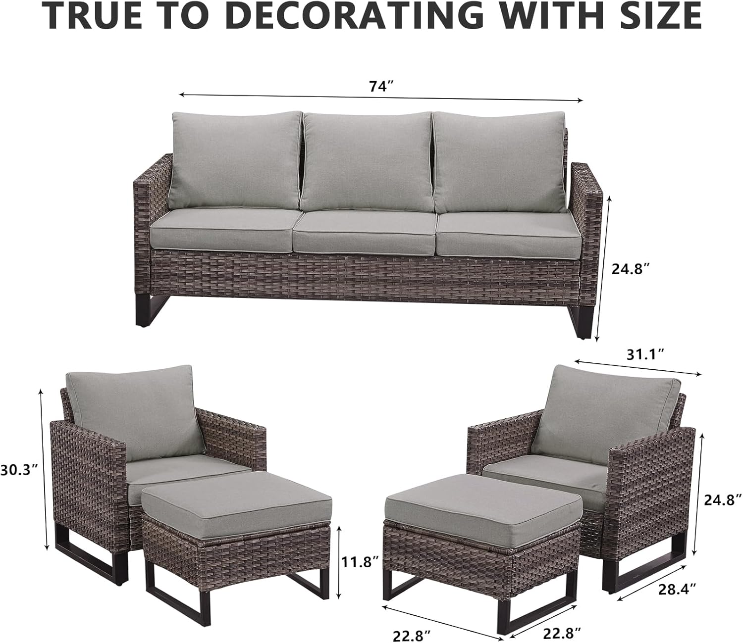 - 【Upgrated Elegant Design】The patio conversation sets is totally upgraded with straight armrest and the heightened ergonomically curved backrest. Allow your back to lean back slightly,The height of sofa and chairs is increased to 30.3 inch,more suitable for American person, Providing more comfortable seating experience,The overall design is more elegant and comfortable.