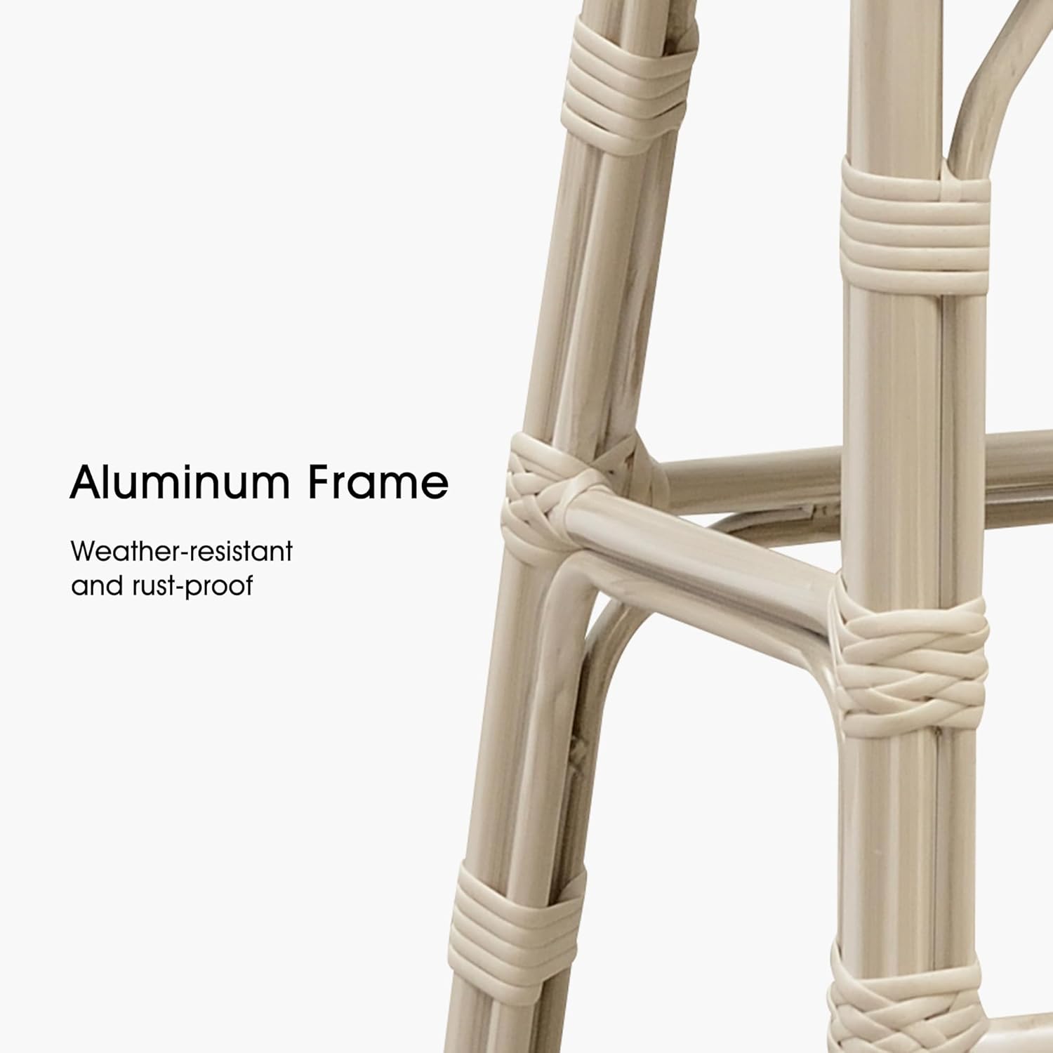 - White Distressed Finish: It's made of powder-coated aluminum that's weather-resistant and rust-resistant. Then a white distressed finish is hand applied to make these aluminum bar chairs look vintage.