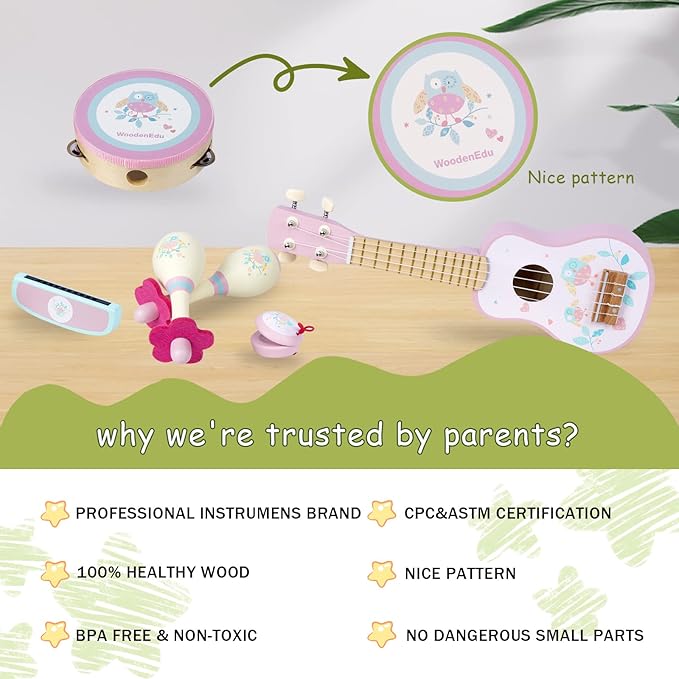 - 6-PIECE MUSICAL INSTRUMENT SET: Our toy set includes a beautifully crafted 1 x 17-inch ukulele, 1 x tambourine, 2 x maracas, 1 x clapper, and 1 x harmonica. Made from child-safe paint finishes and durable wooden materials, it's the perfect gift for boys and girls age 3 and under.