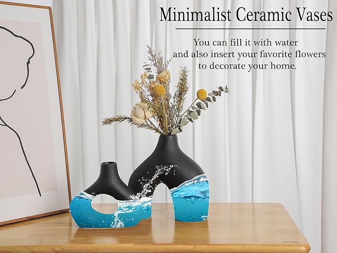 CEMABT Black Ceramic Vase Set of 2 for Modern Minimalist Bohemian Decor,Round Matte Donut Vases for Pampas Grass-Perfect for Living Room, Dining Table, Office Bedroom Shelf Decor Entryway, Console