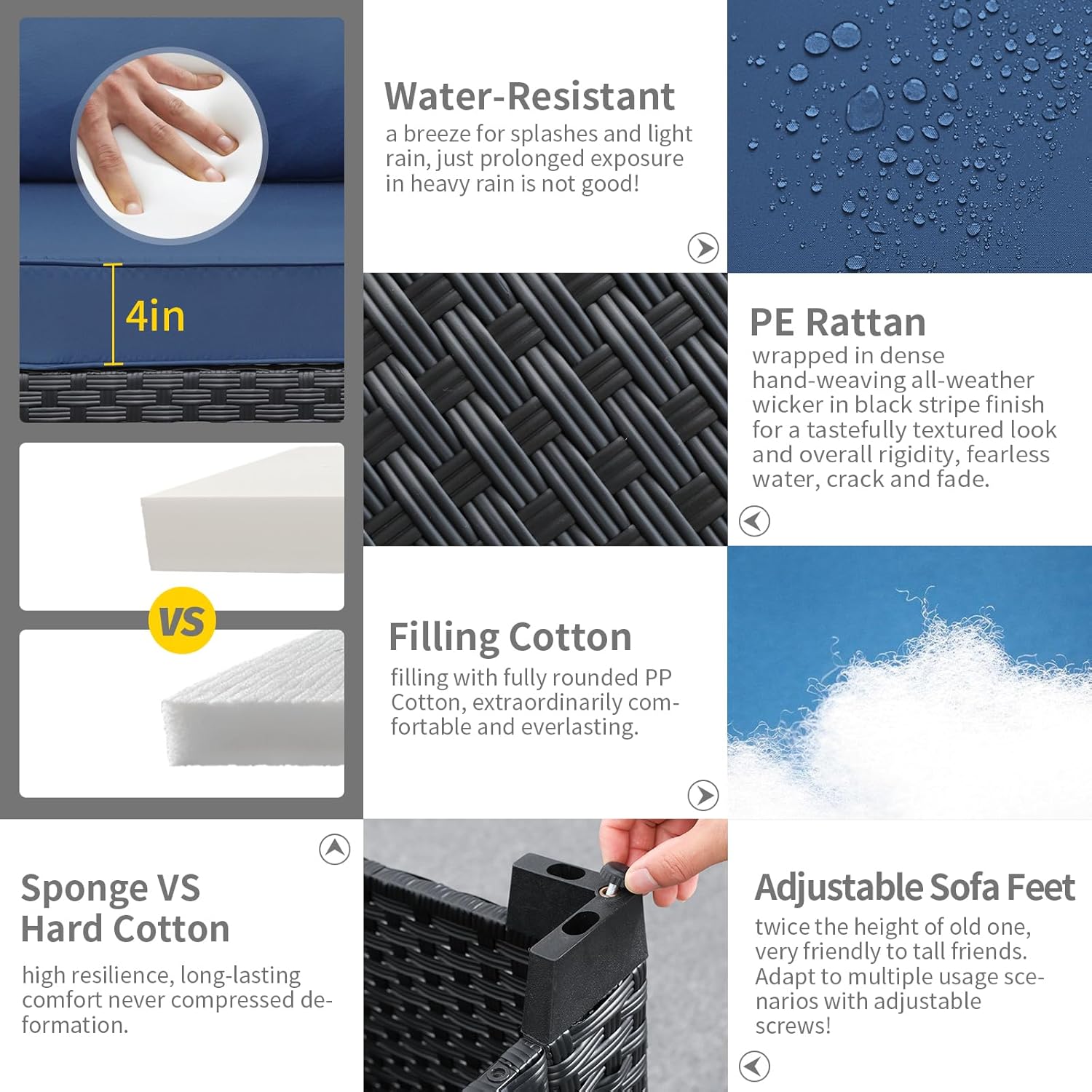 - Quality and Maintain: Delicate composite weaving with half-moon all-weather HDPE wicker material handwoven over fully-welded powder-coated steel framing makes outdoor patio furniture very durable and sturdy. Breathable 250G polyester Anti-UV and water-repellent fabric. Each piece is designed to withstand sunshine beating down and rainstorms rolling through.