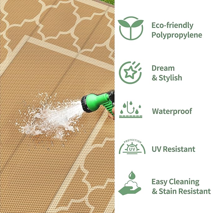 - Versatile Settings:Upgraded polypropylene ensures breathability and fast drying in this outdoor rug waterproof design. Perfect for the patio, deck, backyard, garden, porch, beach, RV, picnic, or camping. Elevate your outdoor experience with GENIMO—whether you're furnishing a peaceful retreat with pamapic outdoor furniture or outfitting your weekend getaway with stylish rv essentials.Also great as fall outdoor decor or a key element in your fall decor transformation