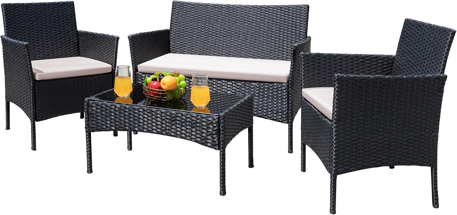 Greesum Patio Furniture 4 Pieces Conversation Sets Outdoor Wicker Rattan Chairs Garden Backyard Balcony Porch Poolside loveseat with Cushion and Glass Table, Black and Beige