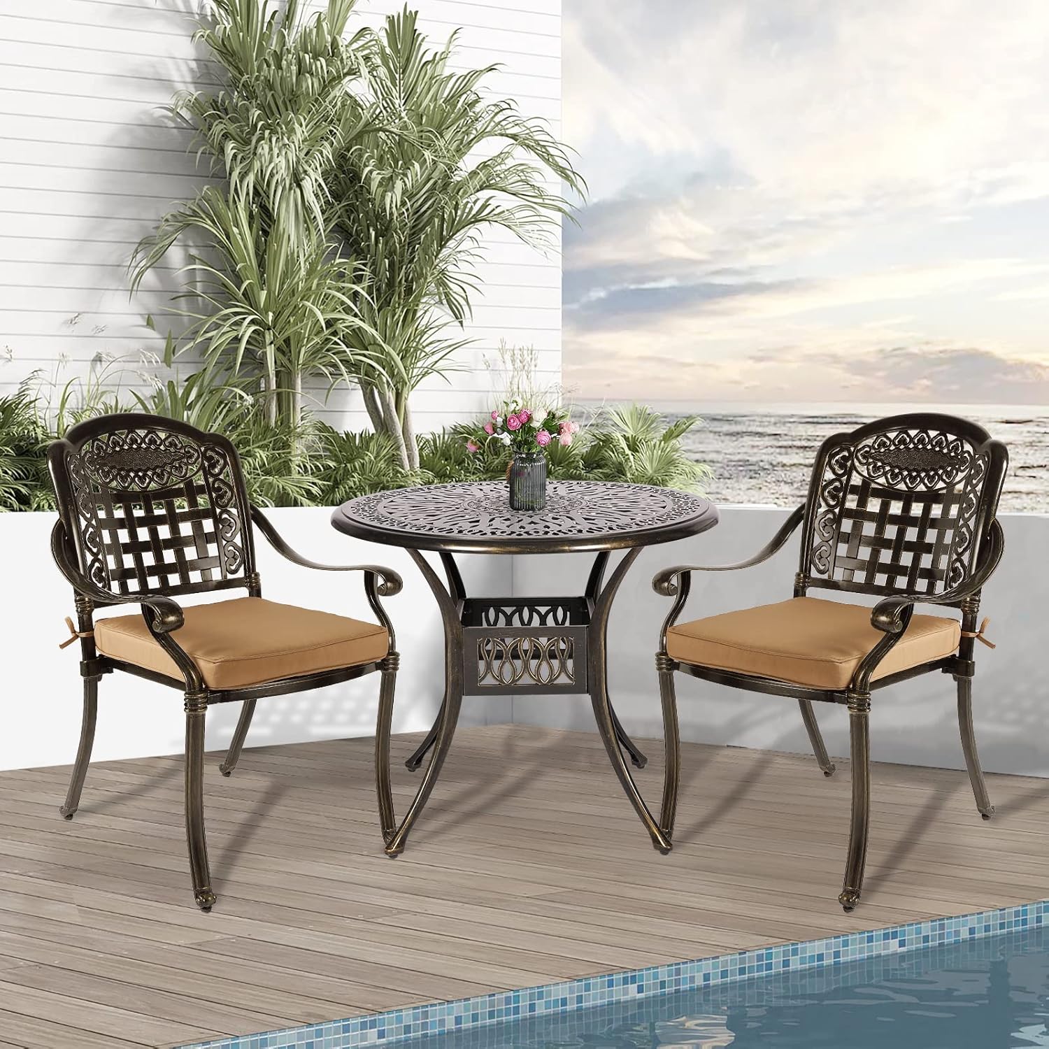 3-Piece Outdoor Patio Dining Set, All-Weather Cast Aluminum Patio Furniture Set for Backyard Garden Deck with 2 Cushioned Chairs and 35.4” Round Table, 2" Umbrella Hole