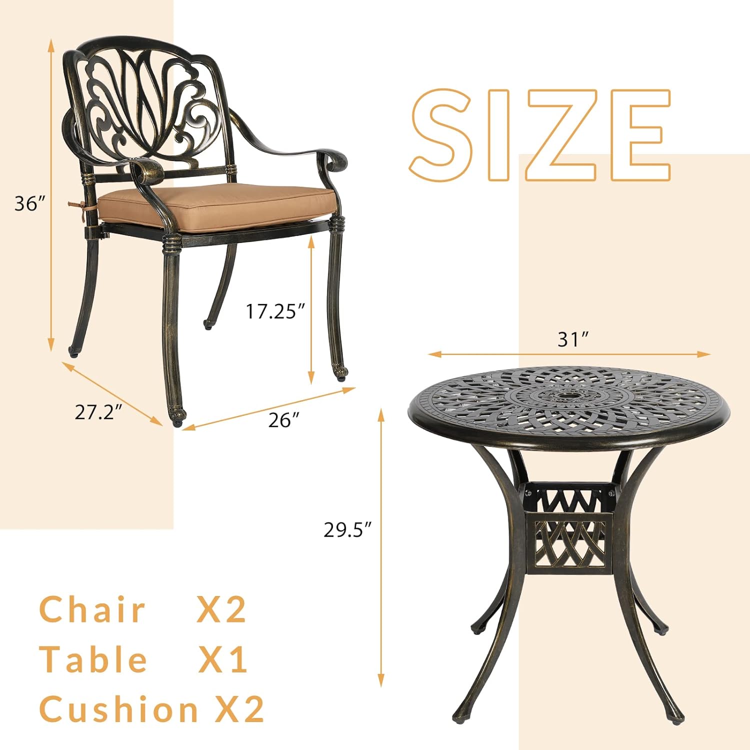 3-Piece Outdoor Patio Dining Set, All-Weather Cast Aluminum Patio Furniture Set for Backyard Garden Deck with 2 Cushioned Chairs and 31” Round Table, 2" Umbrella Hole