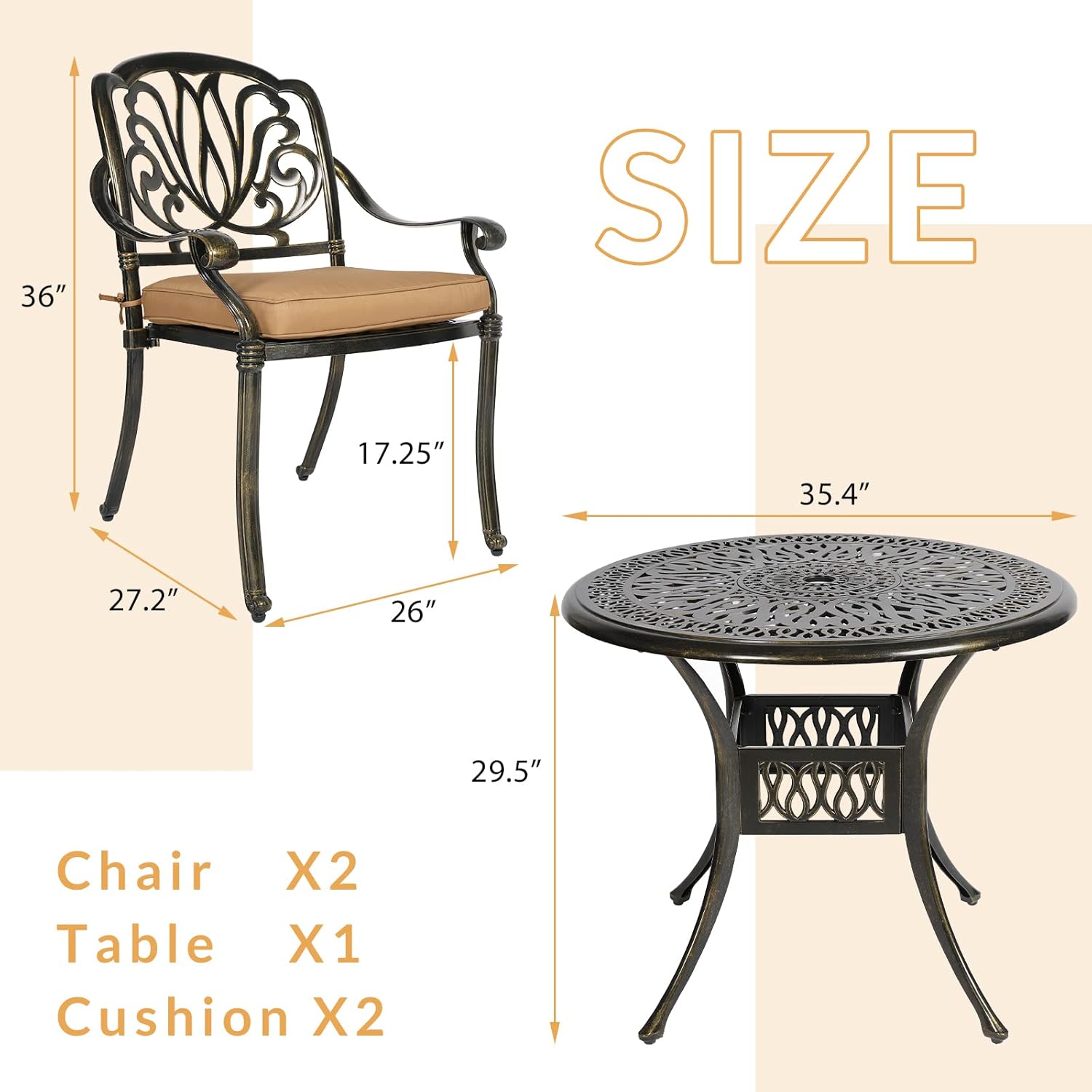 - 【Durable 3-Piece Dining Set】 - Made from cast aluminum for long-term durability. Resistant to rust, weather, fade, crack. This patio set includes 1 round table, 2 chairs, 2 cushions, and they stay in perfect condition regardless of the weather. It's also easier than ever to clean, just use a dry or damp rag to wipe down.