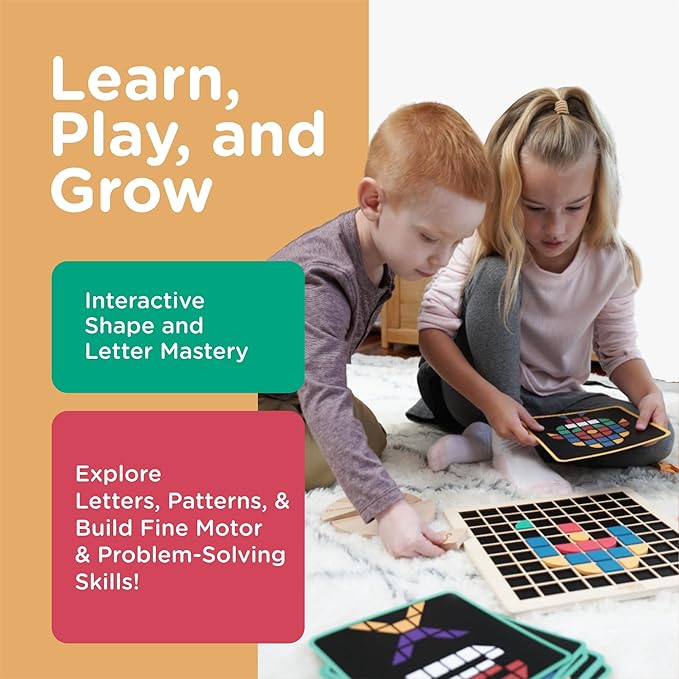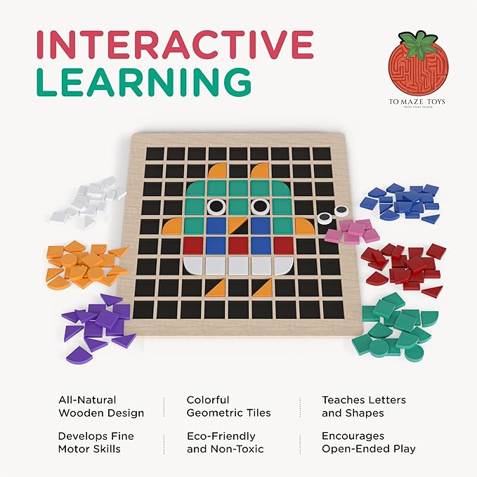 Tomaze Montessori Mosaic Tinker Tangram Set - Large Pixel Pattern Play Blocks, Wooden Grid Board, Educational STEM Puzzle for Learning Letters, Shapes - Safe & Easy To Grasp - Toy Gift for Kids Age 4+