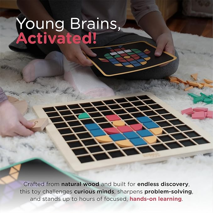 - OPEN ENDED TOY: Encourage spatial reasoning and creative thinking by letting kids find solutions and new ways to fit the wooden pieces together. Children can either follow the cards or create their own images and letters with endless open-ended play possibilities. This tangram style puzzle with geometric wooden pieces of varying shapes and colors lets kids be creative while learning through play.