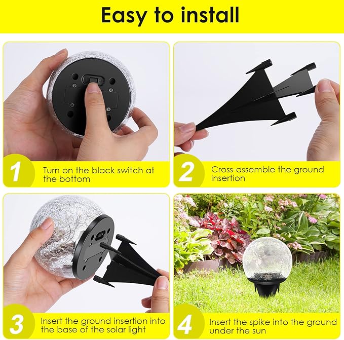 - IP65 Waterproof and Durably: Solar lawn lights decorative are fully enclosed by ABS and cracked glass. Durably construction and weather resistant feature of the solar ball lights outdoor. Our garden lights solar powered are made of IP65 waterproof upgrade and there will be no condensation, can be used in bad weather conditions such as rain, snow, ice, wind and so on