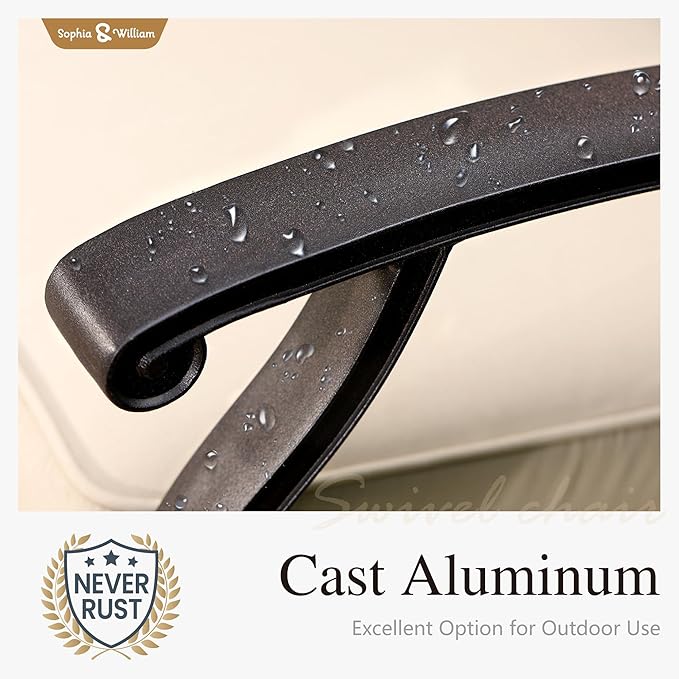 - Premium Material: The patio rectangular table and swivel rocking chairs are made of highquality aluminum and aluminum alloy using traditional cast aluminum technology, this patio dining set is both beautiful and elegant. The natural alumina protective film on the surface of cast aluminum provides excellent rust and water resistance, while the special powdercoating process further strengthens its performance