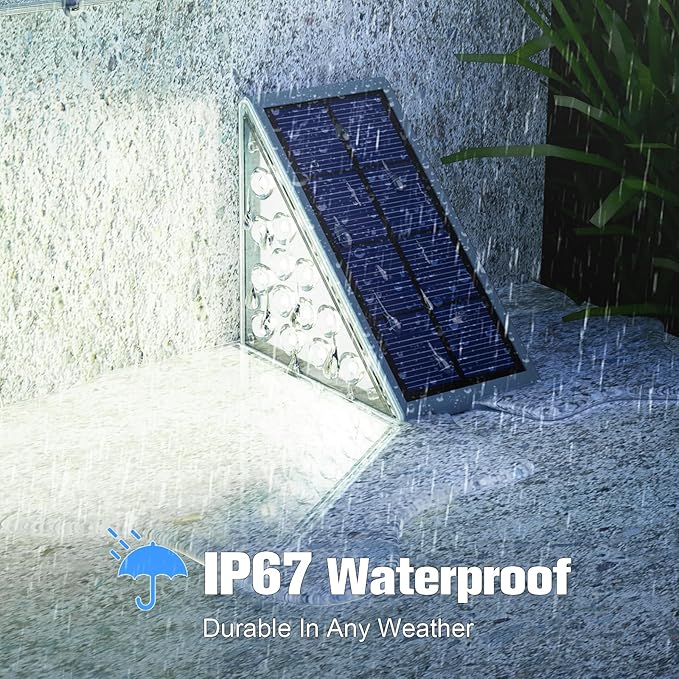 - 【Waterproof IP67】Solar step lights outdoor waterproof led are made of high-quality ABS materials, fully enclosed integrated design, waterproof IP67, withstand various weather, containing rainstorm, snow and frost. Tips:If you intend to bring sidewalk lights indoors in the winter ,you can just place them on the steps without sticky tape ,according to your actuall situation.