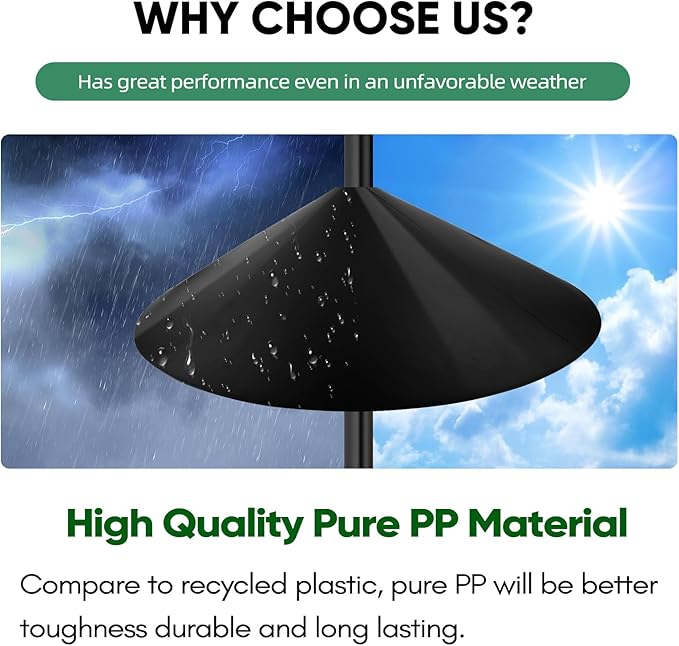 - 【Easy to Use】--You just need to connect the squirrel buster by push it stuck point for better fixing. Ensure the squirrel deflector is 4 to 5 feet from the trunk of the tree (or any other platform).Protect your bird feeder and keep those pesky squirrels at bay with this baffle for bird feeder. It's reliable, practical. So why wait? Grab yours today and enjoy a peaceful bird feeding experience.
