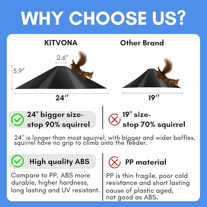 - 【Reliable and Practical】--This squirrel guard is made by using a high quality ABS material which makes it durable, long lasting and UV resistant. Compare to PP, it has a good hardness and UV resistant, uneasy to crack, wear-proof and weather fastness, no fear of rain or sunburn.