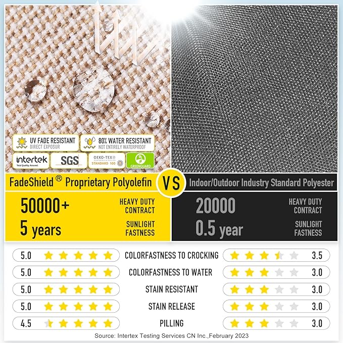 - 【FadeShield - UV Fade Resistant】FadeShield Proprietary Polyolefin are dependable indoor/outdoor performance fabrics, they are infused with antimiсrоbial silver Ion technology and can withstand 5 years of UV fade resistance, solution-dyed to make sure that each color is deeply ingrained in every fiber for continued vibrancy, even after heavy use. We recommend bringing it indoors when it rains or when not in use to preserve its lifespan and keep it looking beautiful.