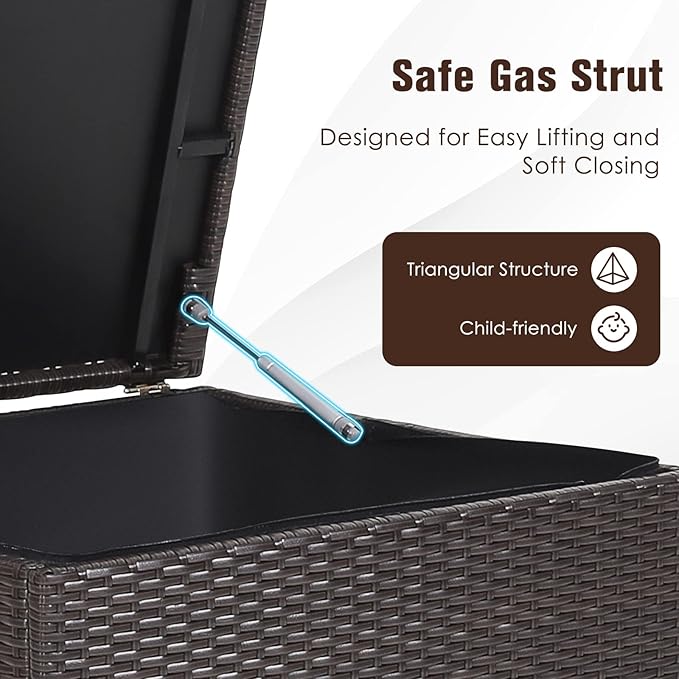 - Waterproof Liner: This deck box is equipped with waterproof liner to protect your items from rain and dust. It can be zippered up for all-round protection. And then, the safe pneumatic rod with triangular structure is designed for soft closing and easy lifting.