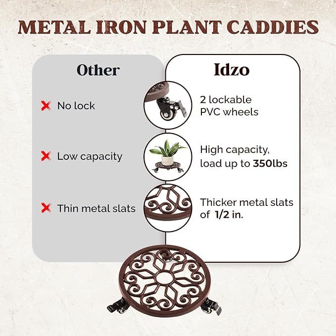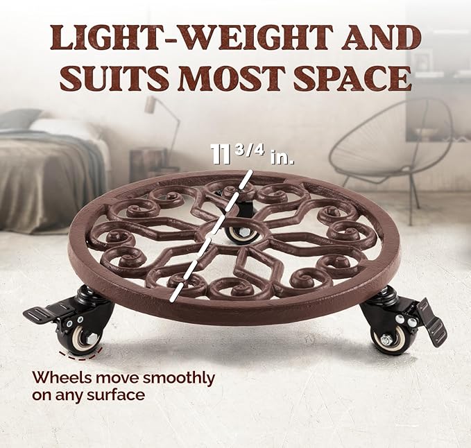 IDZO Heavy Duty Trolley Capacity 350 lbs Planter Caddies with Wheels Heavy Duty Cast Iron Plant Stand with Lockable Wheels Plant Stand 12 Inch Simple Style Dark Brown