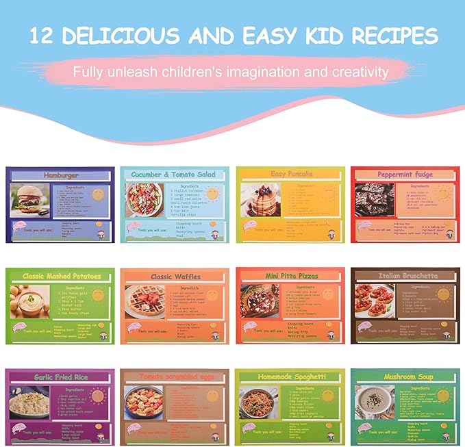 - Recipe cards provide creative ideas for your little chef's cooking. We have 12 delicious recipes suitable for children who want to learn how to start cooking. Encourage children to participate more, while also exercising their hand eye coordination skills, enhancing cognitive abilities, and cultivating healthy life skills.