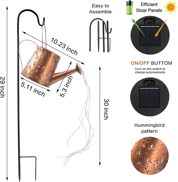 - 【Solar Watering Can With Lights】This solar outdoor lights is a unique and attractive outdoor decoration for gardens,vividly imitating the effect of flowing water.There are 6 copper string lights with a length of 25.9 inches (75 centimeters) and 42 ultra bright LEDs.The 32 inch shepherd hook attached to the solar waterfall lights is a perfect addition to garden decoration for your vines,potted plants,porch,path, terrace,and more.