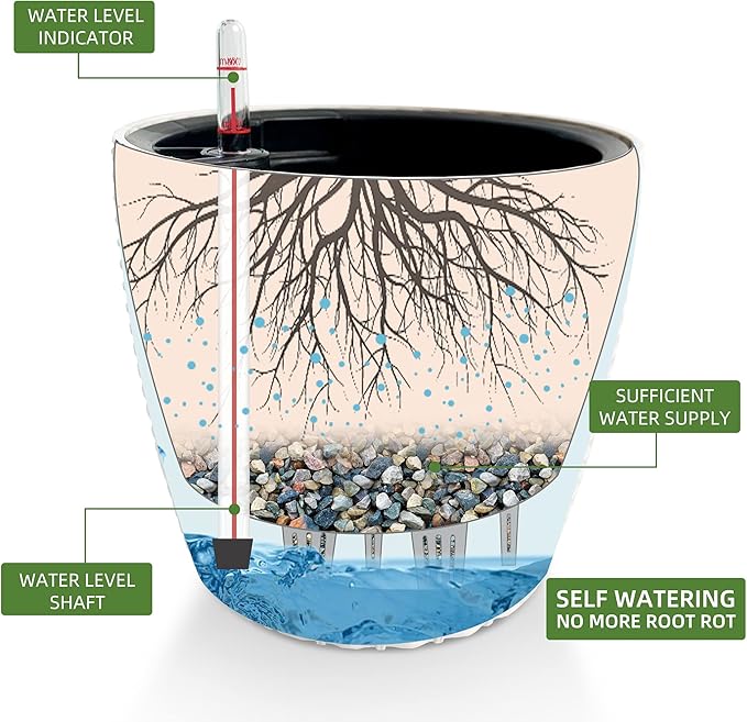 - NEVER MISS WATERING AGAIN - The hydroponic device keeps water ready, then watering time is at your discretion on the gauge. The design of drainage plug and spillway hole is to avoid cycles of overwatering and underwatering, pull out the plug to drain the excess water on rainy days outdoors. The sufficient water supply system enables double the water-efficient than conventional pots. Don't be anxious about missing watering while you enjoy a long term holiday on a journey or travel outside