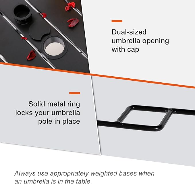 - 【Metal Table Top with Umbrella Hole】This dining table is outfitted with a dual-sized hole for umbrella. Its 1.57"/1.9" diameter hole fits most patio umbrellas for shading outside.