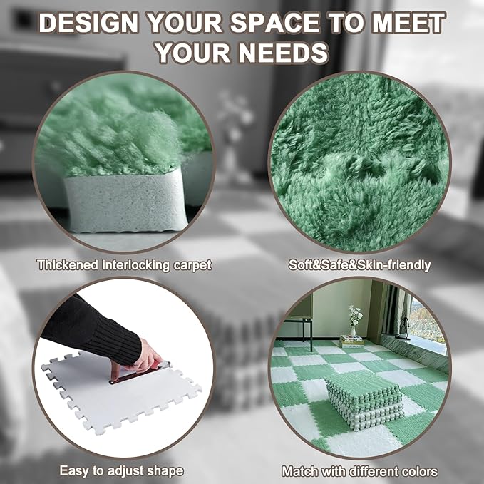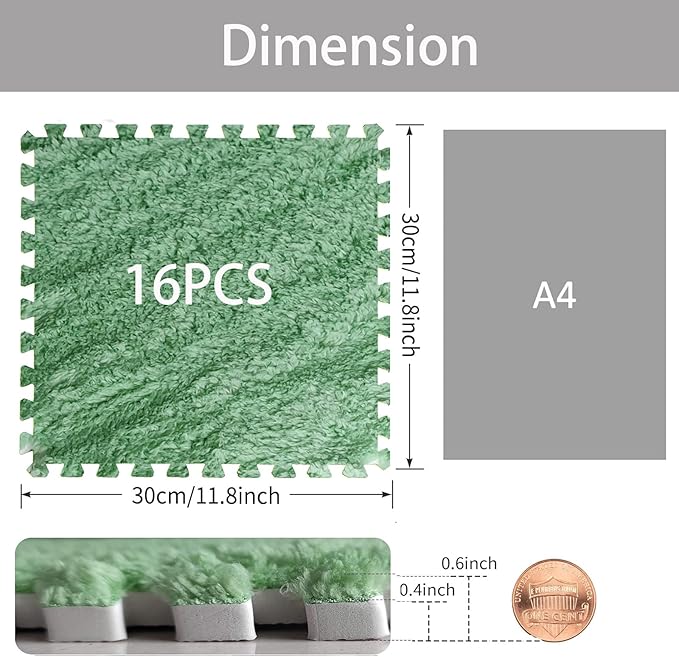 16pcs 0.6" Thickened Interlocking Tile Mats,Fluffy Shaggy Soft EVA Foam Area Rug for Living Room & Bedroom,Non-Slip Protective Floor Carpet Play Mat Kids Dorm Home Decor (11.8ft, Mint Green)