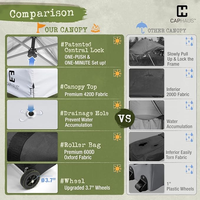 - Patented One-Push Set Up - Experience the easiest set up with the CAPHAUS ez up canopy! Our patented one-push center lock technology allows you to lock out all four legs with a single push, while the soft pinch-free buttons let you adjust the leg height from 3ft 4” to 6ft 4” without any hassle. Don't settle for complicated canopies – choose CAPHAUS and set up your shelter effortlessly!