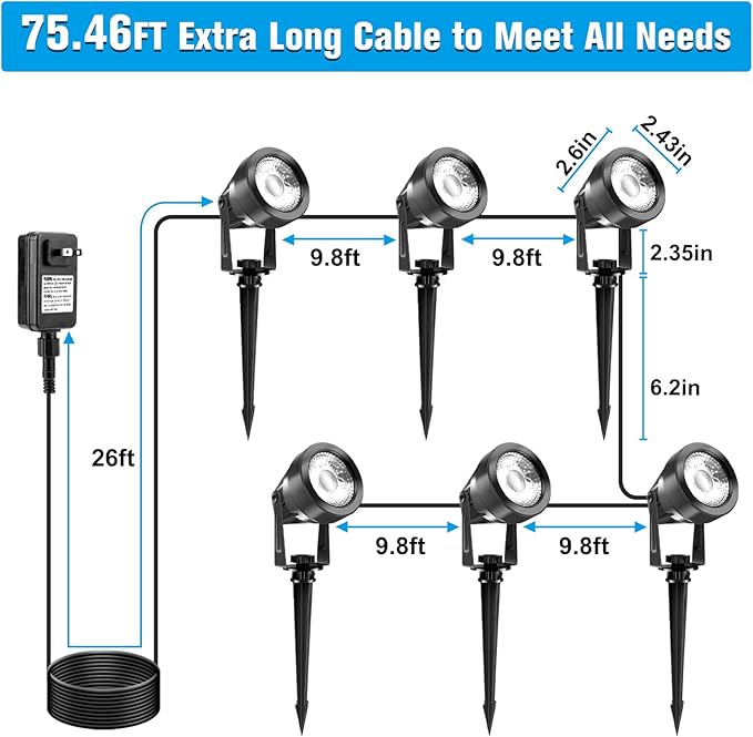 - 【75.46FT Extra Long Cable】We have ultra long cables to meet your needs. Let you have a long enough distance between each Christmas light. The distance from the plug to the first Christmas spotlight is 26FT. The distance between the Christmas landscape lights is 9.8FT, which meets your daily lighting needs.