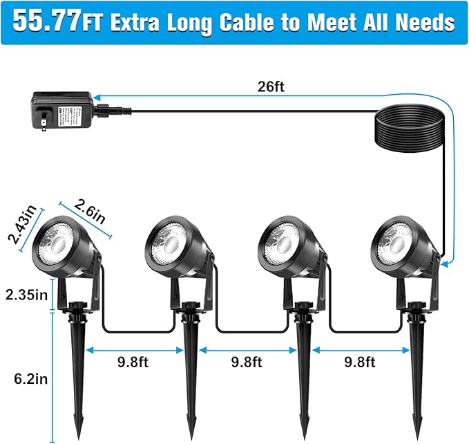 - 【55.77FT Extra Long Cable】We have ultra long cables to meet your needs. Let you have a long enough distance between each Christmas light. The distance from the plug to the first Christmas spotlight is 26FT. The distance between the Christmas landscape lights is 9.8FT, which meets your daily lighting needs.