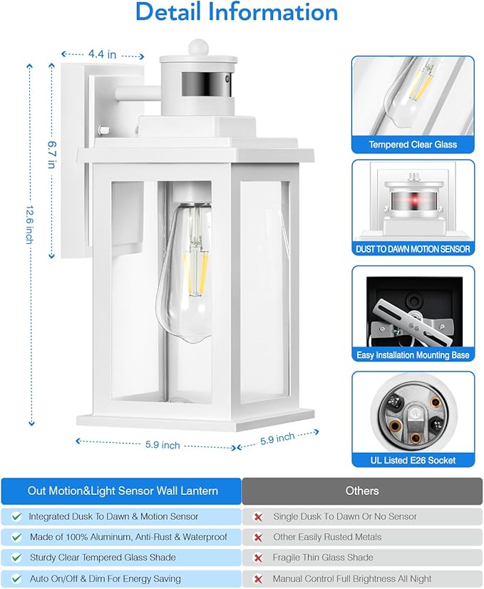 - Easy to Install & E26 Socket: Say goodbye to tedious assembly process and choose exterior lights for house, which are easy to install without hiring an electrician, helping you save high electrician fees! The bottom opening design makes bulb replacement simple and quick, and is conducive to heat dissipation, providing you with years of lighting experience. To avoid flickering problems, motion lights for outside are recommended to use dimmable LED bulbs or incandescent bulbs! (Bulbs not included)