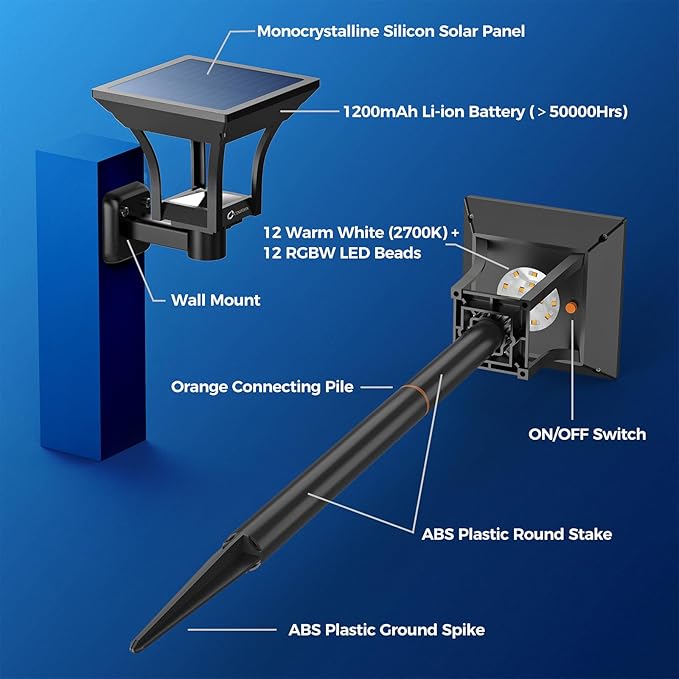 - 【IP65 Waterproof & Long-lasting】Made of ABS plastic and reaching the sealing process with an IP65 waterproof rating, our solar powered outdoor lights are designed to withstand most weather conditions, such as sunny, rainy, frosty, sleet or light snowy days for multi-season outside use.