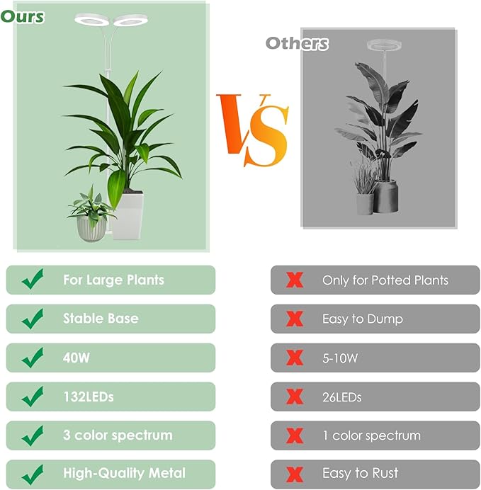 - [Suit for Medium- and large-sized Plants]: The plant growth lamp features a new adjustable 2-head design that can be 360°positioned, providing a larger and more uniform coverage of plants. It comes with a high-quality base stand that ensures stability. The plant light is equipped with 3 detachable aluminum alloys that can be adjusted to heights of 32/47/63 inches. It is ideal for home gardening, flower exhibitions, large potted plants, and exceptionally large indoor plants.