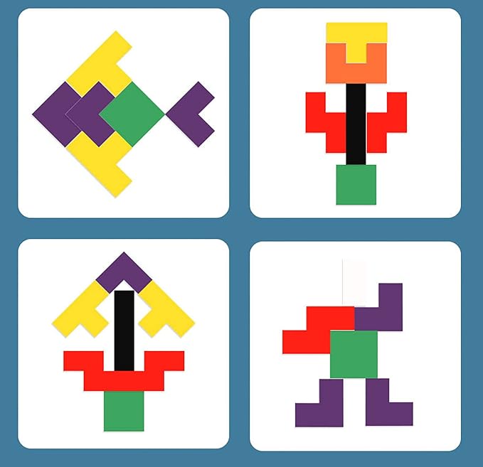 - Geometric assembling shape pattern block tangram brain teaser blocks use common geometric patterns and colors to keep children busy for different options to play. Solving it themselves helps to keep kids’ brain focused and adds creativity to eye-hand coordination and color & shape recognition