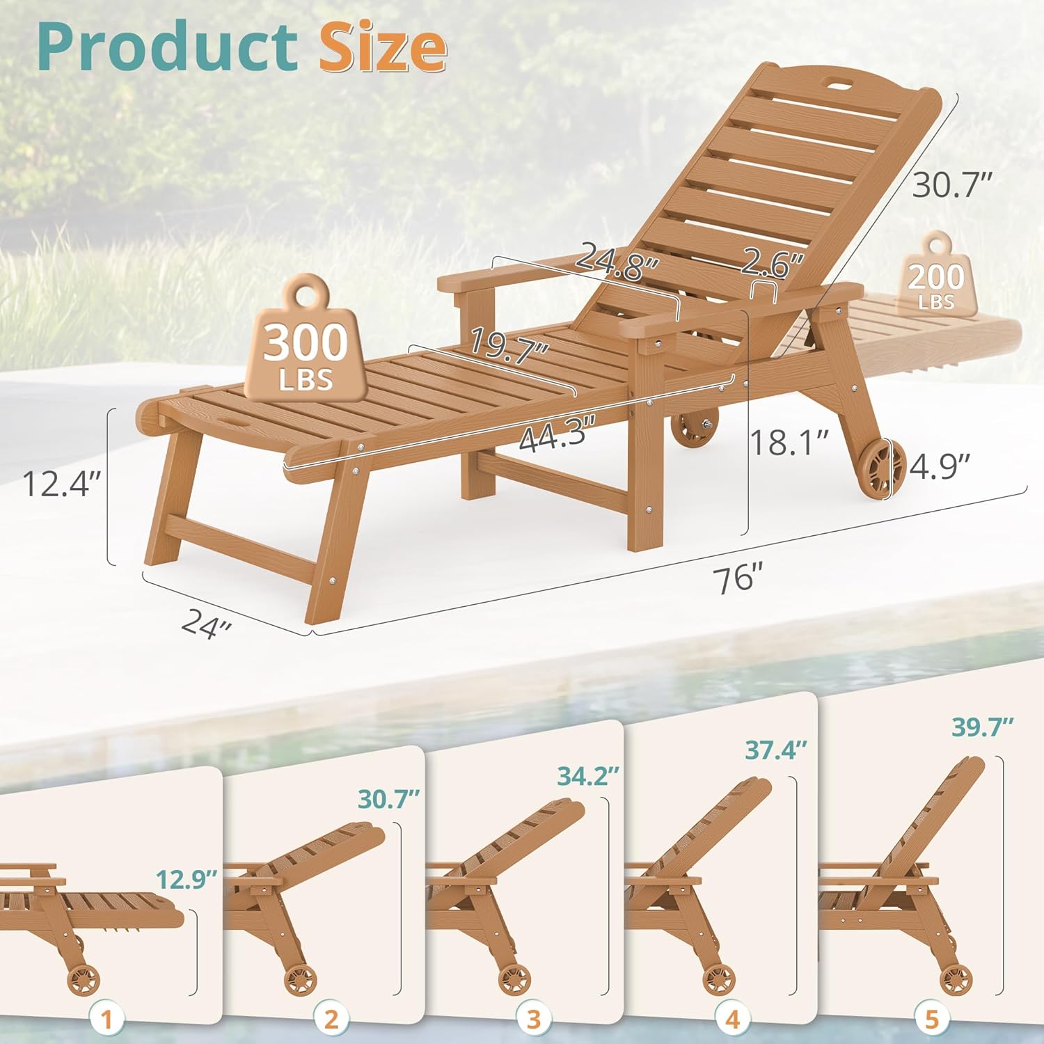LUE BONA Chaise Lounge Chairs Set with Table, 3-Piece, HDPS Chaise Lounger, 5 Positions Adjustable Lounge Chairs, Pool Lounge Chair with Wheels for Poolside, 3 Year Warranty, Teak Color
