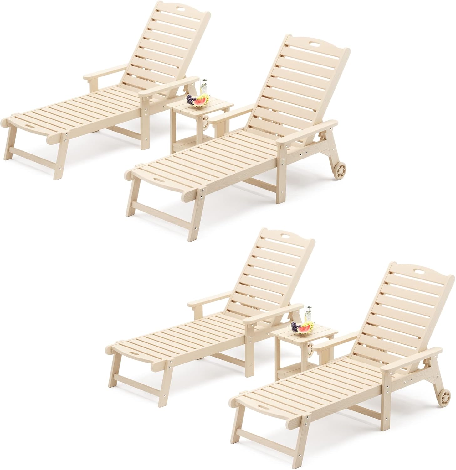 LUE BONA Chaise Lounge Chairs Set with Table, 6-Piece, 79'' Oversized HDPS Chaise Lounger, 5 Positions Adjustable Patio Lounge Chairs, Pool Lounge Chair with Wheels for Poolside, 3-Year Warranty, Sand
