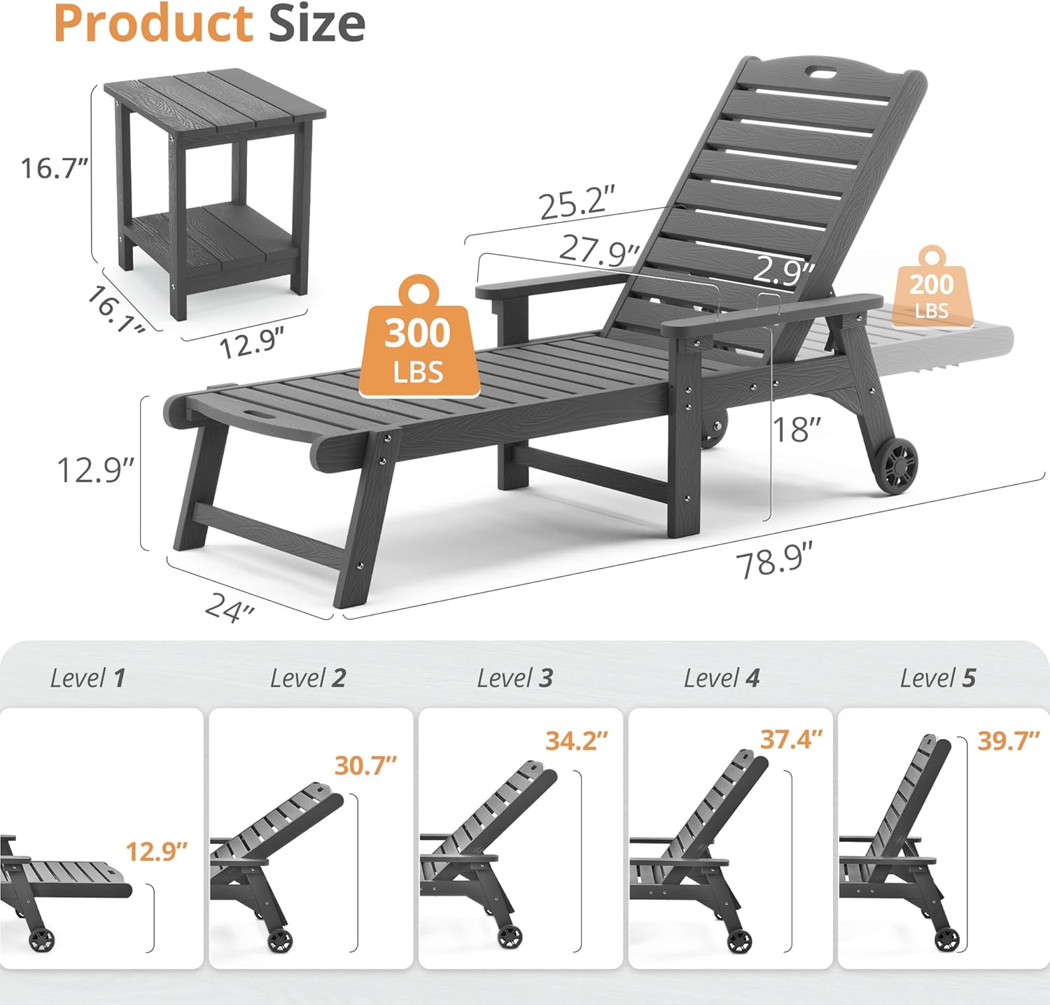 LUE BONA Chaise Lounge Chairs Set with Table, 6-Piece, 79'' Oversized HDPS Chaise Lounger, 5 Positions Adjustable Lounge Chairs, Pool Lounge Chair with Wheels for Poolside, 3 Year Warranty, Dark Gray