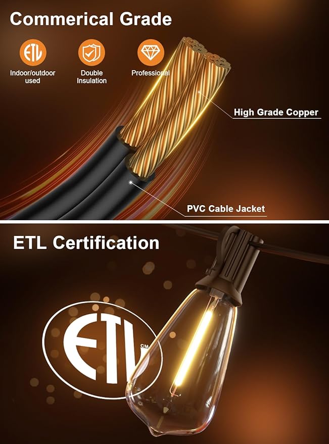 - Special Feature : Brightness dimmable, ETL listed heavy duty, Commercial grade strands, For Patio, Backyard, Umbrella, Bistro, Pergola, Café, Commercial Space, Garden, Wedding, Party, Christmas trees, Room and various occasions or events Brightness dimmable, ETL listed heavy duty, Commercial grade strands, For Patio, Backyard, Umbrella, Bistro, Pergola, Café, Commercial Space, Garden, Wedding, Party, Christma… See more