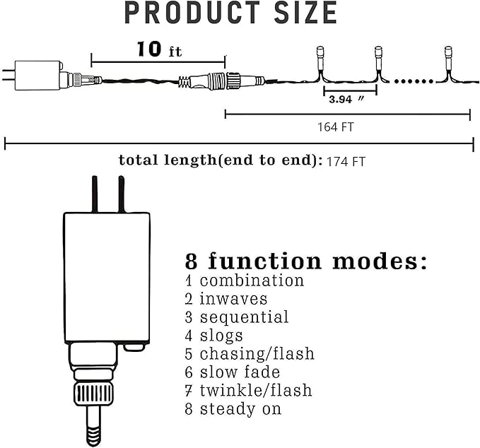 - 8 Lighting Modes: These Christmas lights offer eight distinctive lighting modes - combination, in waves, sequential, slow glow, chasing/flash, slow fade, twinkle/flash, and steady on. Each style imparts a bespoke ambiance, granting you the liberty to choose the right one to match different settings and moods.