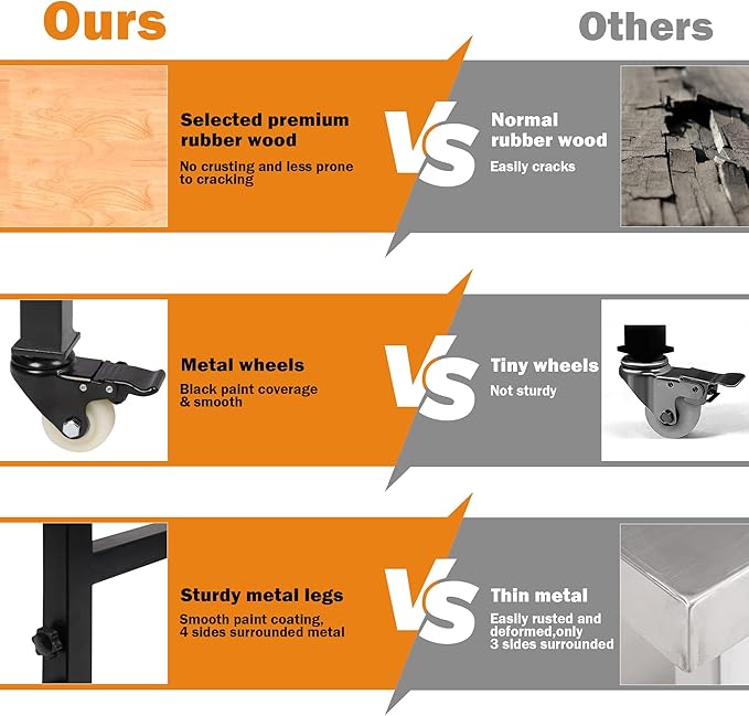 - 【UPGRADE METAL WHEELS】Unique black metal wheels with brake, Get your workstation anywhere. The smooth giant TPR wheels make it easy to move the table.Responsive brakes just only need to be pressed lightly