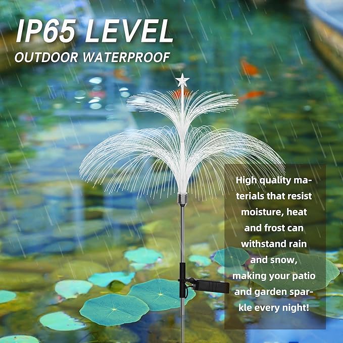 - Dance with the Wind - Our solar garden lights are double jellyfish with stars on them, which looks more attractive than the ordinary single jellyfish lights. The fiber optic material is soft and flexible, and the unique design structure makes it sway with the wind, just like the beautiful colorful jellyfish dancing in the water, adding a romantic atmosphere to your yard and bringing you a good mood.