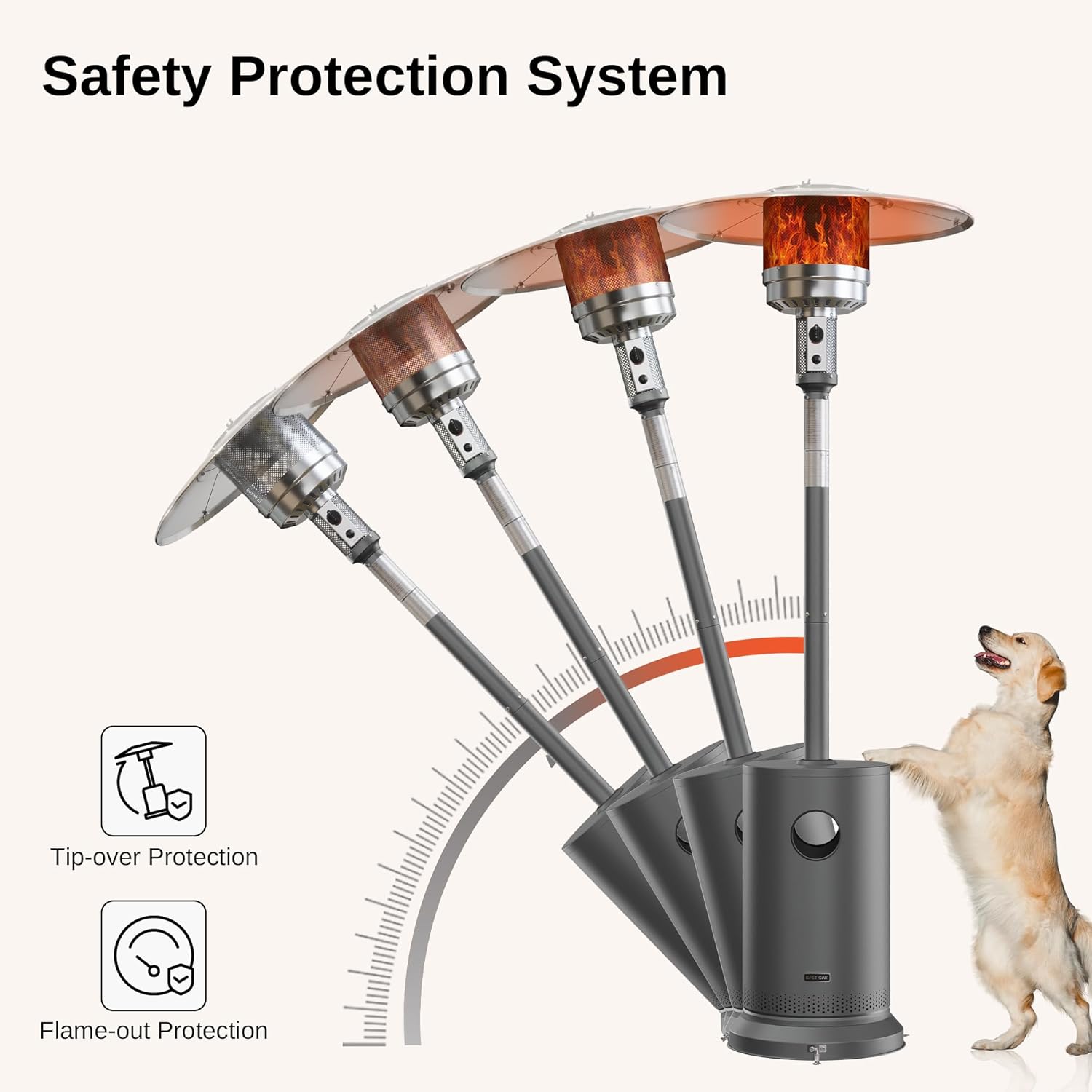 - 𝗦𝗮𝗳𝗲𝘁𝘆 𝗣𝗿𝗼𝘁𝗲𝗰𝘁𝗶𝗼𝗻 𝗦𝘆𝘀𝘁𝗲𝗺: The Tip-over Protection system will shut off the flame when the patio heater propane is tilted more than 45 degrees. If the flame goes out, the Flame-out Protection system automatically shuts off the gas supply