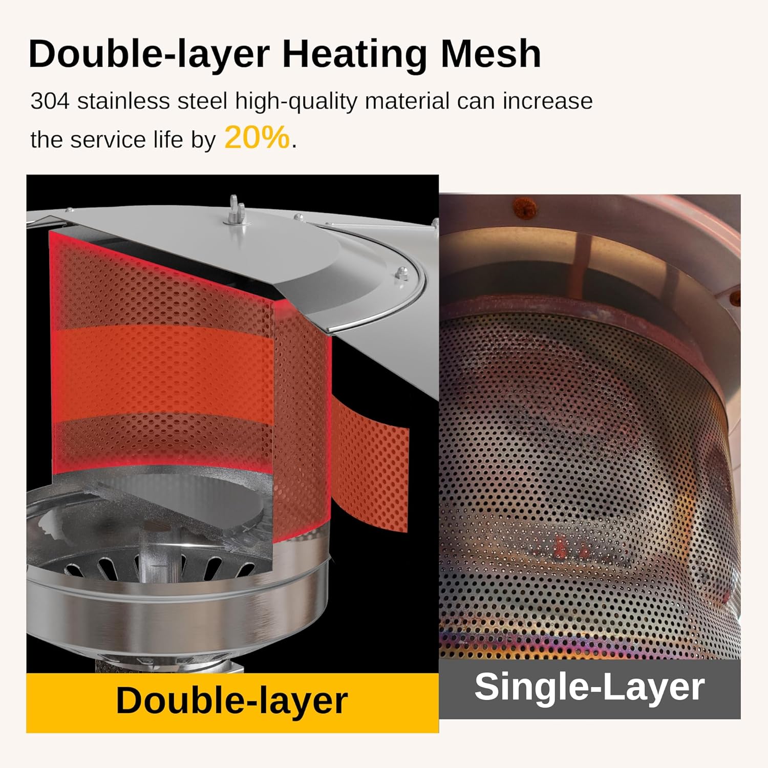 - 𝗠𝗼𝗿𝗲 𝗗𝘂𝗿𝗮𝗯𝗹𝗲 𝗗𝗼𝘂𝗯𝗹𝗲-𝗹𝗮𝘆𝗲𝗿 𝗛𝗲𝗮𝘁𝗶𝗻𝗴 𝗠𝗲𝘀𝗵: High-quality 304 stainless steel is used in our double-cover heating mesh design. Compared with a traditional single layer burning mesh heater, the EAST OAK Outdoor Heater is stronger, more durable, and safer, and the service life is improved by 20%