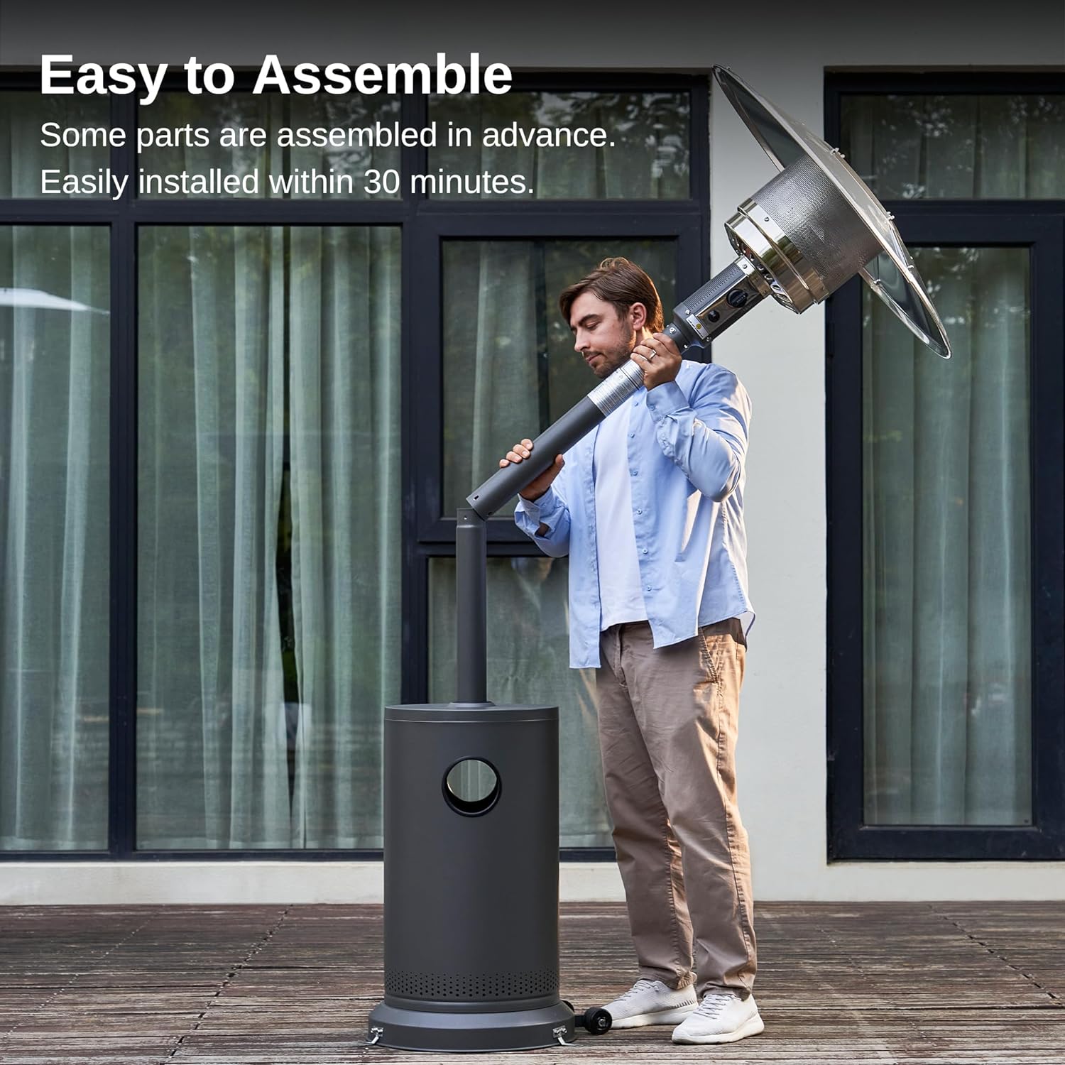 - 𝗘𝗮𝘀𝘆 𝘁𝗼 𝗔𝘀𝘀𝗲𝗺𝗯𝗹𝗲 𝗮𝗻𝗱 𝗠𝗼𝘃𝗲: Some parts are assembled in advance, and the upgraded reflector shield only needs to be assembled with three reflector pieces. The installation of the entire product, following the instructions, can be completed in about 30 minutes. The Outdoor Patio Heater has two wheels on the bottom for smooth movement