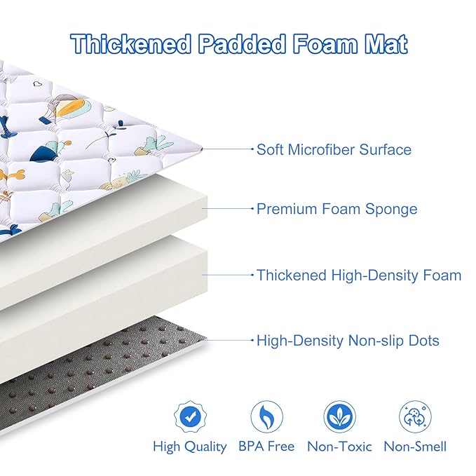 - Portable & Non-slip: This one-piece play mats for floor can be easily folded for easy to pack to carry or store to save space. The non-slip bottom design ensures stability and safety during playtime, providing a safe place for your kids to romp around