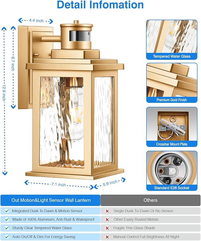 - ✨[ Unique Appearance Ideal ] Upgrade your outdoor space with our unique gold outdoor light fixture - the ideal complement to your house style. Our water-rippled tempered glass beautifully ripples over the bulb, creating a stunning ambiance and illuminating your outdoor space perfectly. Ideal for creating a low-key luxury atmosphere, our carriage lantern is the ideal choice for anyone looking to upgrade the look and feel of their outdoor area.